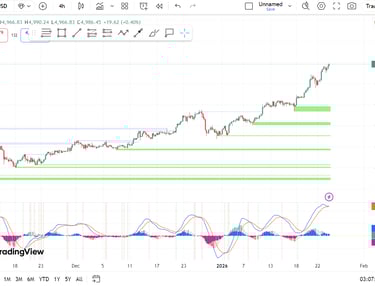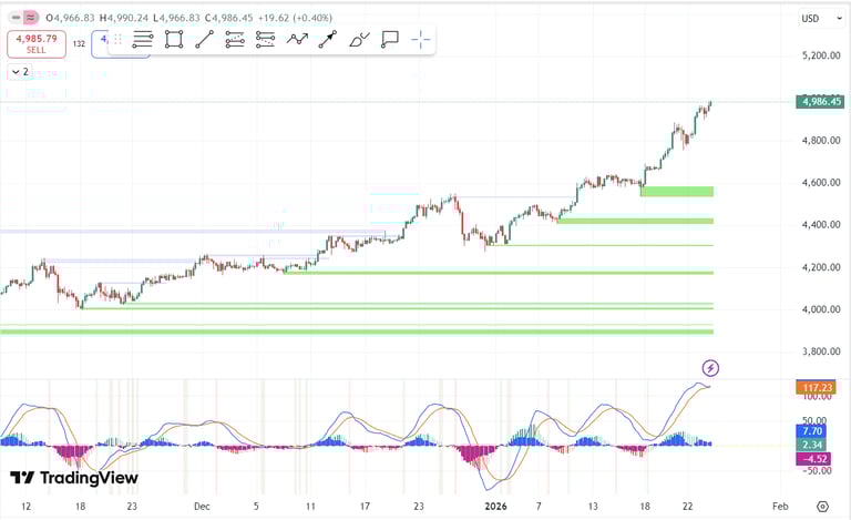 Cấu trúc xu hướng: Vàng đang trong trạng thái "Hyper-Bullish". Giá đã bứt phá hoàn toàn khỏi các kênh tăng giá cũ và đang di chuyển trong vùng "không có kháng cự" về mặt kỹ thuật, ngoại trừ các mốc tâm lý tròn số.