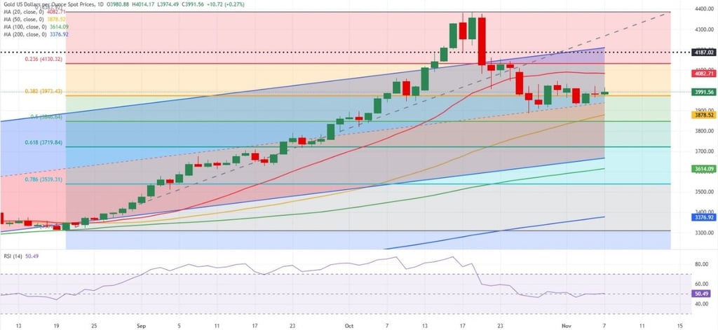 Dữ liệu công bố cuối tuần từ Hoa Kỳ cho thấy Chỉ số Tâm lý Người tiêu dùng của Đại học Michigan (UoM) đã giảm xuống 50,3 trong tháng 11 từ mức 53,6 của tháng 10. Do đồng USD không thoát khỏi áp lực giảm giá vào cuối tuần, giá vàng vẫn quanh quẩn ở mức 4.000 đô la.