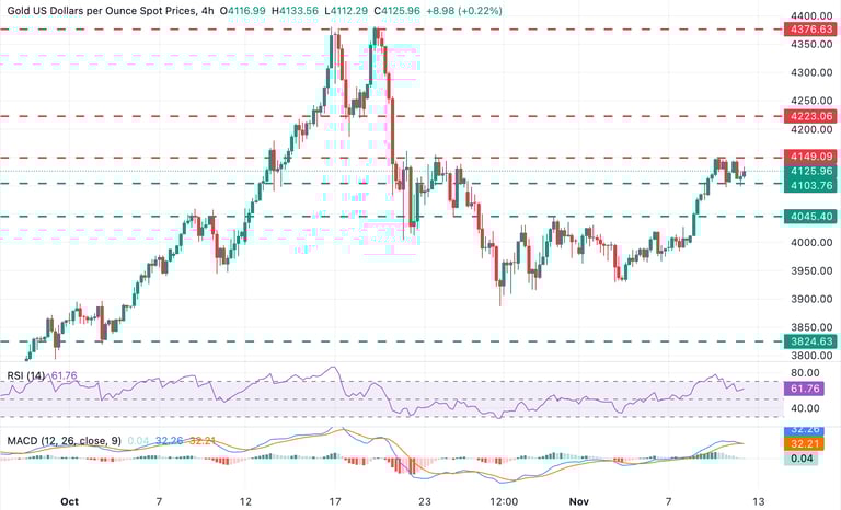 Nhận định XAU/USD ngày 12/11/2025: Vàng (XAUUSD) đang tăng tốc khi dữ liệu lao động yếu kém và những rủi ro chính trị chưa được giải quyết tại Mỹ làm tăng kỳ vọng về việc Fed sẽ cắt giảm lãi suất vào tháng 12.