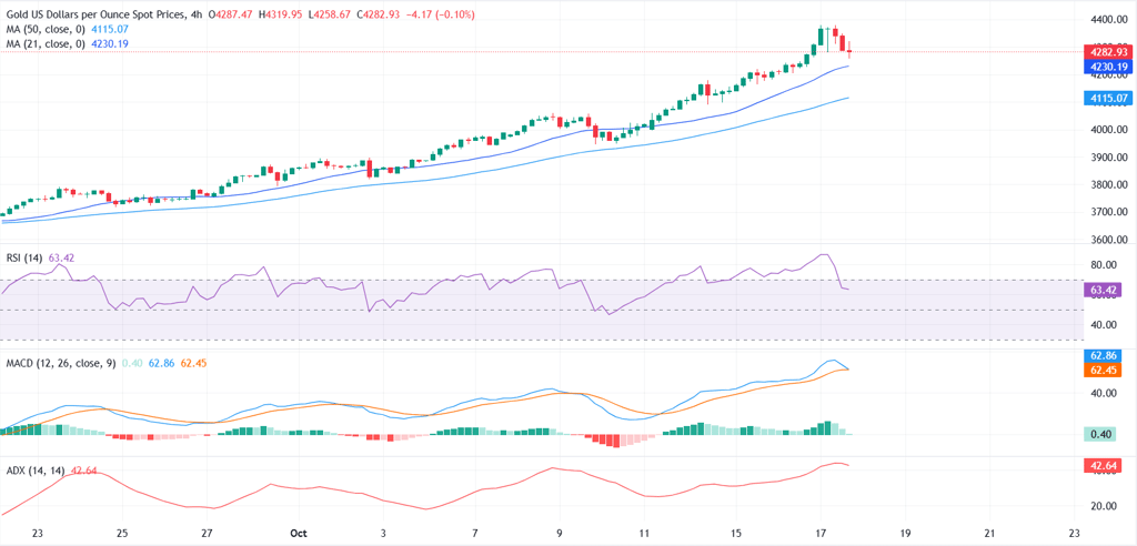 Trên biểu đồ 4 giờ, ngưỡng hỗ trợ ngay lập tức nằm tại đường trung bình động đơn giản (SMA) 21 kỳ gần mức 4.230 đô la, tiếp theo là đường trung bình động 50 kỳ quanh mức 4.115 đô la. Chỉ số sức mạnh tương đối (RSI) đã giảm xuống khoảng 64, thoát khỏi vùng quá mua, điều này có thể cho phép giá tích lũy trước khi tăng tiếp.