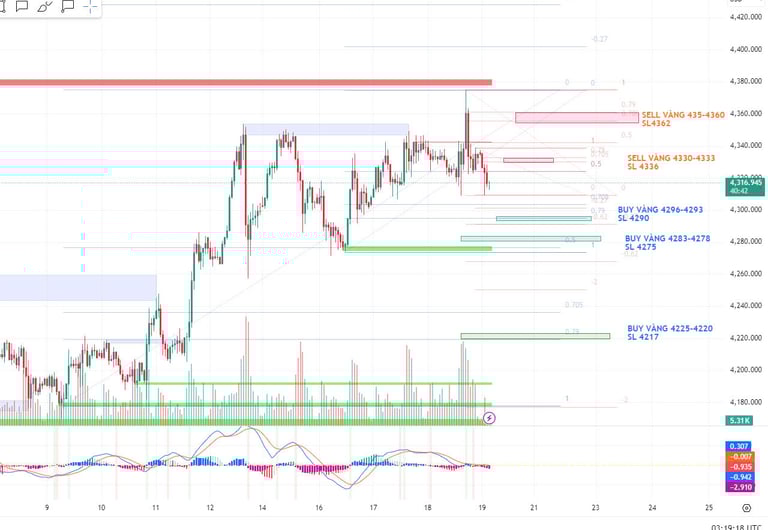 Mua (Buy) 4.293 – 4.296. TP 4.313 - 4.338. SL 4,391. Hỗ trợ gần nhất để đánh lướt.