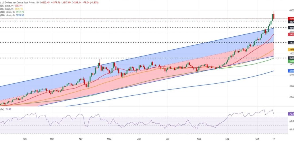 Việc phân tích Vàng từ góc độ kỹ thuật là một nhiệm vụ khó khăn, bởi vì khung thời gian hàng ngày, hàng tuần và hàng tháng đều cho thấy tình trạng quá mua cực độ. Ngoài ra, việc đặt mục tiêu tăng giá cũng là một thách thức khác vì XAU/USD đã lập kỷ lục mới trong năm ngày liên tiếp. Do đó, các mức giá tròn có thể được coi là ngưỡng chốt lời tiềm năng ở mức 4.400 đô la, 4.500 đô la và 4.600 đô la.