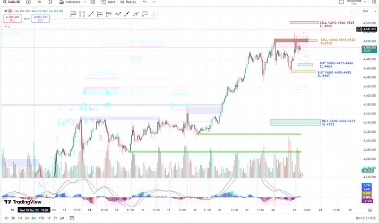 Bán (Sell) 4.560 – 4.565. TP 4.523 - 4.478 .SL 4.568. Vùng kháng cự cao hơn nếu giá bứt phá mạnh.