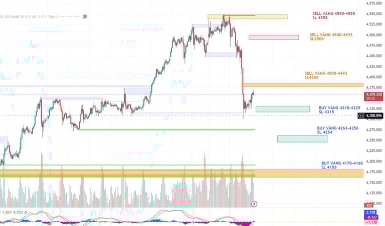 Biến động mạnh: Sau khi duy trì đà tăng ấn tượng và đạt đỉnh quanh vùng 4,550, giá vàng đã bất ngờ "đổ đèo" giảm hơn 200 giá về vùng 4,318 trước khi có nhịp hồi nhẹ. Điều này cho thấy áp lực chốt lời diện rộng đang diễn ra.